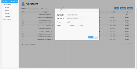 2)? 納稅人點擊“申請授權”按鈕后,填寫相關信息,選擇用戶身份,點擊“提交”按鈕。