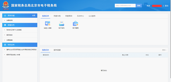 1.? 納稅人進入北京市電子稅務局系統,點擊“用戶注冊”按鈕,進行用戶注冊;