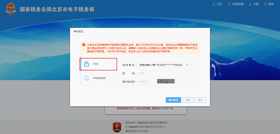 1.? 選擇密碼方式登錄,選擇需要登錄電子稅務局的人員身份,輸入密碼(密碼為電子稅務局個人賬號登錄密碼)、圖片驗證碼,點擊“驗證”按鈕,即可進入電子稅務局首頁界面;
