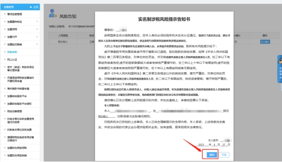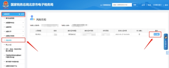 二、發(fā)票使用—風(fēng)險告知,進(jìn)入雙向?qū)嵜J(rèn)證模塊(此處只顯示當(dāng)前登錄人員的信息,所以需要給誰做雙向?qū)嵜J(rèn)證,則需要使用該人員的信息驗證登錄),點(diǎn)擊【本人確認(rèn)】。